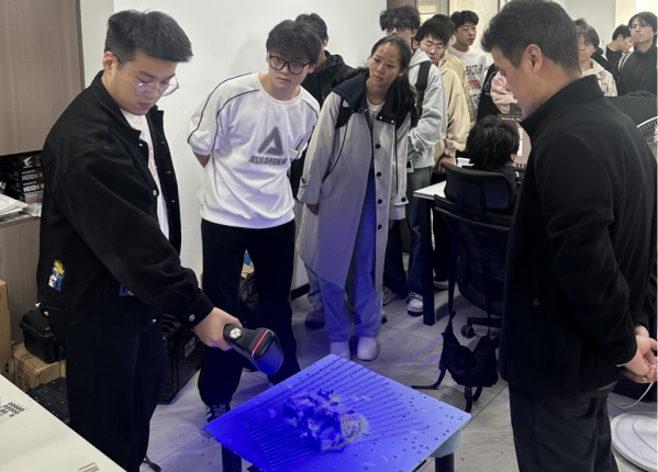 随后,学子们前往三维扫描技术体验区,近距离感受数字化建模的前沿科技。技术人员通过专业三维扫描仪,现场演示了“实物扫描 - 数据采集 - 模型生成” 的完整流程:将一件工业零件样品放置于扫描区域后,设备通过非接触式扫描技术快速采集物体表面三维数据,点云数据实时传输至电脑,短短1分钟内便精准还原出零件的三维模型,清晰呈现其复杂结构与细节特征。技术人员结合工业设计应用场景,详解了三维扫描在逆向设计、快速复刻、定制化建模等领域的实用价值,让大家直观理解数字化技术如何为设计创作提质增效。